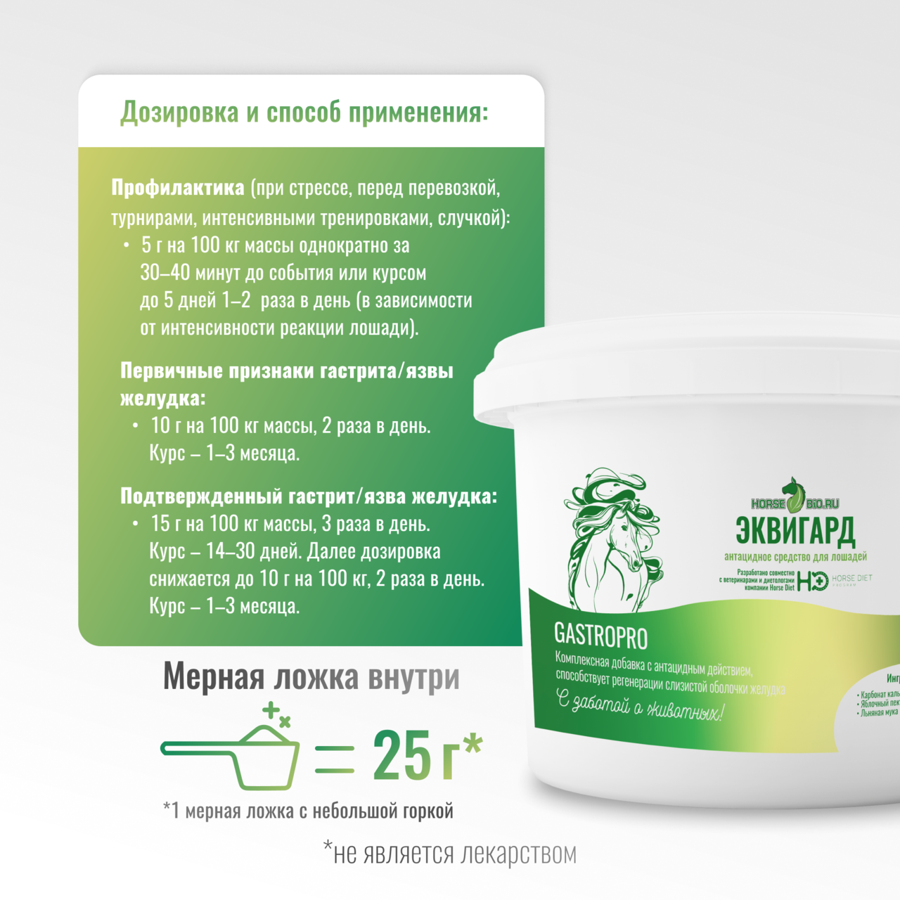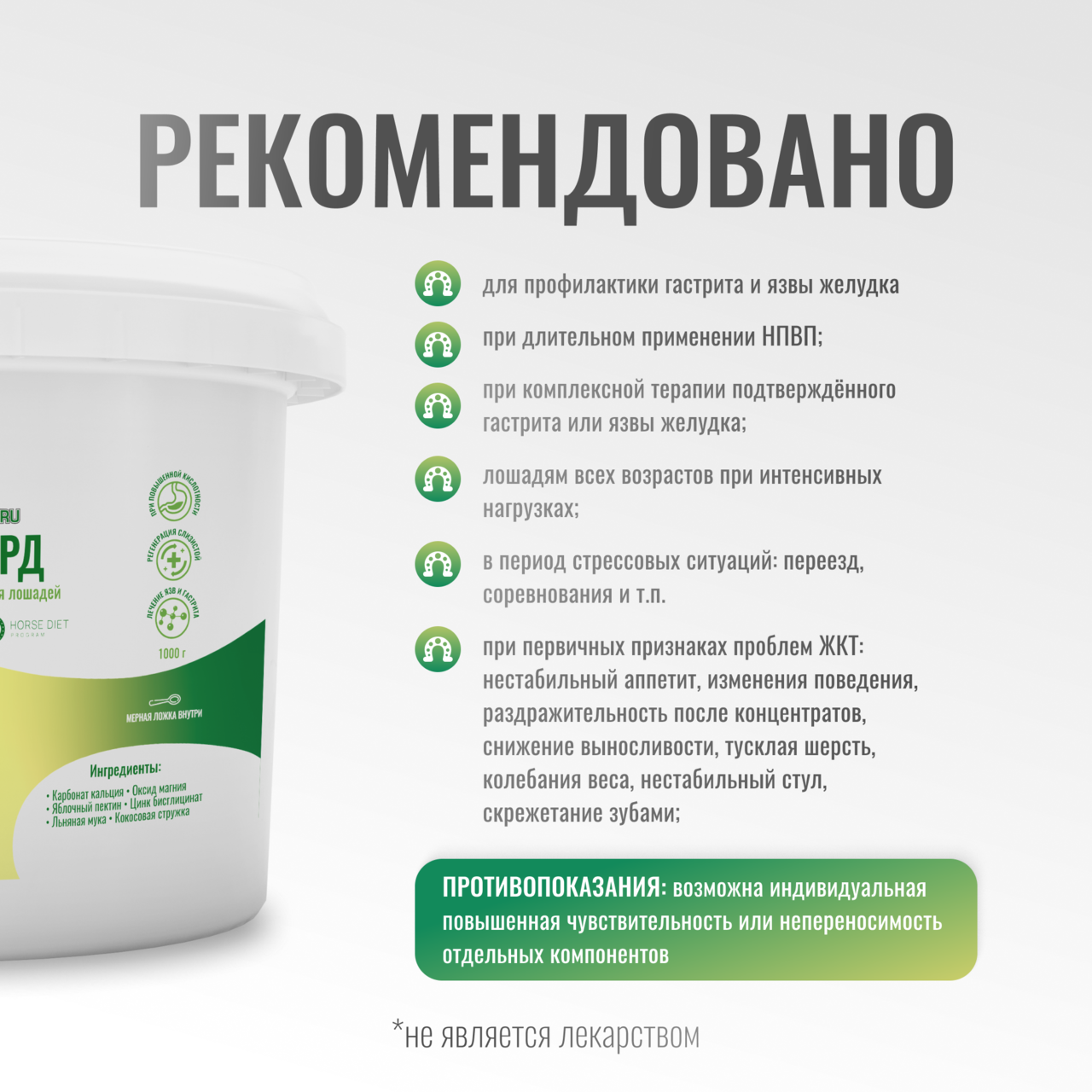 Комплексная добавка с антацидным действием для профилактики и лечения гастрита и язв желудка у лошадей. Оказывает буферное, обволакивающее и регенеративное действие на слизистую оболочку желудка. Разработано совместно с ветеринарами и диетологами компании Horse Diet.
